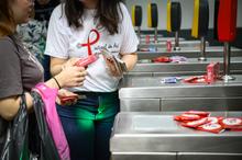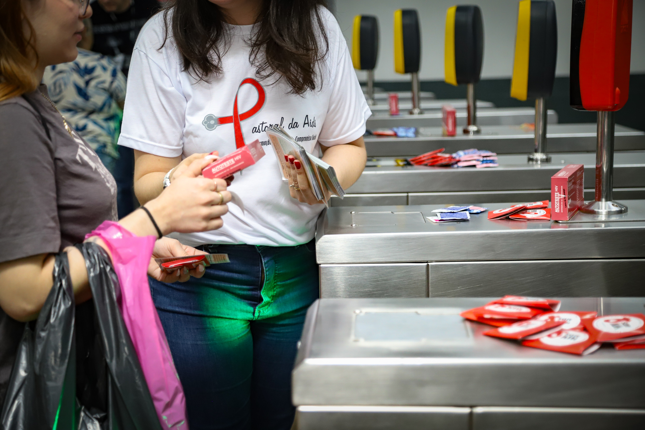 Porto Alegre, RS, 01/12/2025 O mês de dezembro é dedicado à conscientização, prevenção e enfrentamento ao HIV/Aids. A programação organizada pela SMS começou nesta segunda-feira, 1º, Dia Mundial de Combate ao HIV. Pela manhã, nas estações Mercado, Rodoviária e Farrapos da Trensurb, profissionais de saúde abordaram usuários com orientações, distribuição de autotestes, preservativos, gel lubrificante e folders. Foto: Cristine Rochol/PMPA