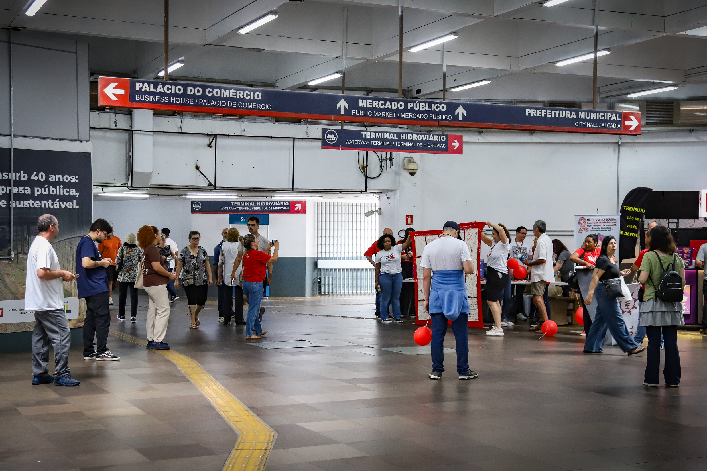 Porto Alegre, RS, 01/12/2025 O mês de dezembro é dedicado à conscientização, prevenção e enfrentamento ao HIV/Aids. A programação organizada pela SMS começou nesta segunda-feira, 1º, Dia Mundial de Combate ao HIV. Pela manhã, nas estações Mercado, Rodoviária e Farrapos da Trensurb, profissionais de saúde abordaram usuários com orientações, distribuição de autotestes, preservativos, gel lubrificante e folders. Foto: Cristine Rochol/PMPA