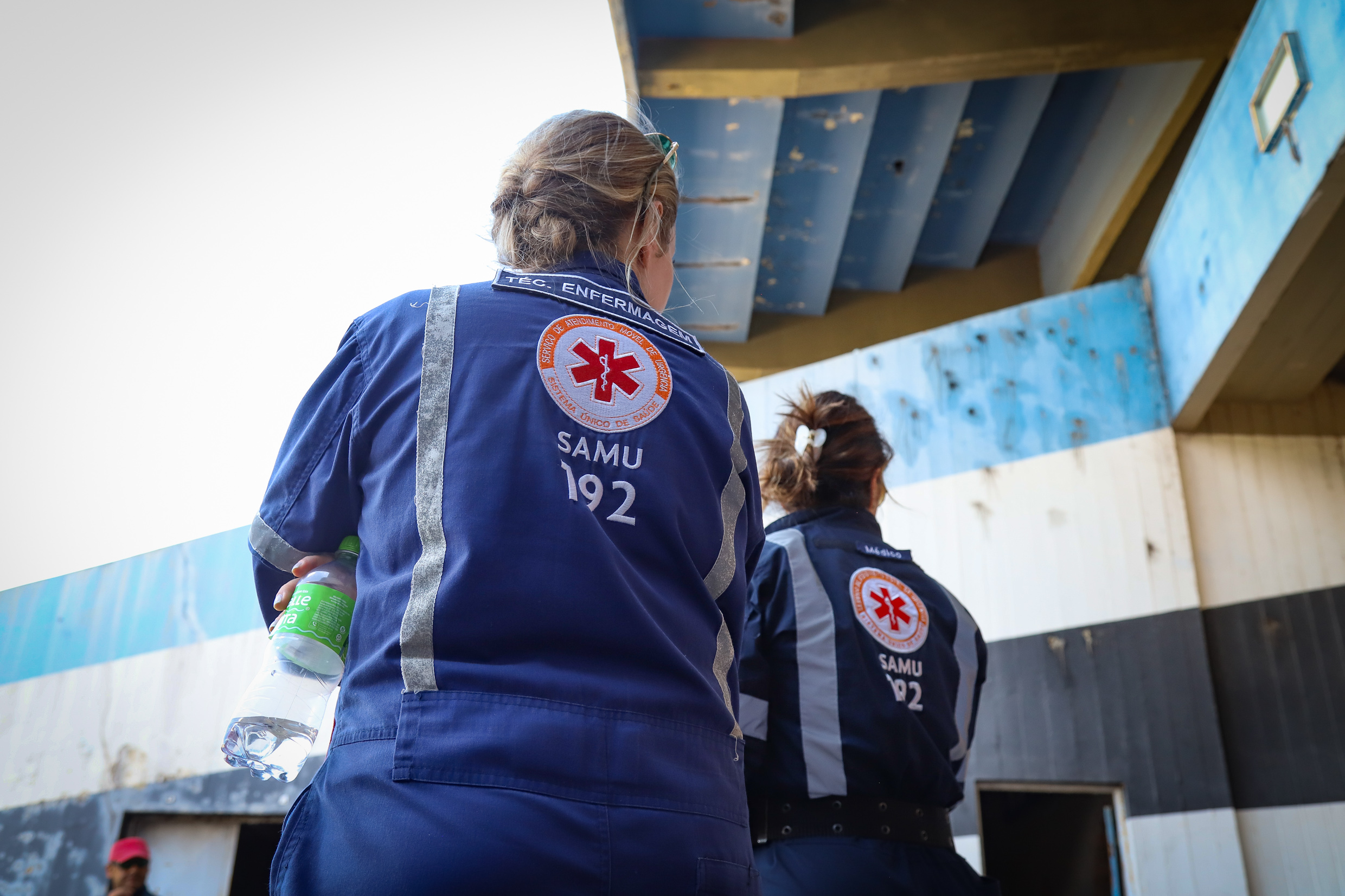 Porto Alegre, RS, 03/12/2025 Equipes do SAMU, vinculadas à Secretaria Municipal de Saúde, integraram um treinamento multidisciplinar ao lado da Defesa Civil e do Corpo de Bombeiros Militares do RS. Com aulas teóricas e simulações de resgate em estruturas colapsadas, a ação teve o objetivo de harmonizar os papéis de cada corporação em cenários de desabamento. O foco central foi aprimorar o trabalho integrado para assegurar a proteção dos agentes e o salvamento eficaz das vítimas. Na foto a parte prática realizada no antigo estádio Olímpico de Porto Alegre. Foto: Cristine Rochol/PMPA