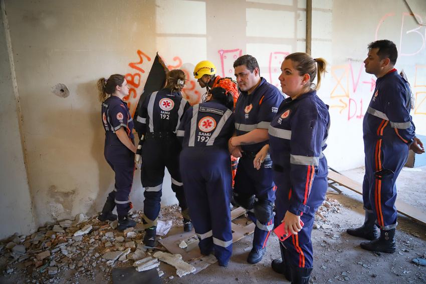 Porto Alegre, RS, 03/12/2025 Equipes do SAMU, vinculadas à Secretaria Municipal de Saúde, integraram um treinamento multidisciplinar ao lado da Defesa Civil e do Corpo de Bombeiros Militares do RS. Com aulas teóricas e simulações de resgate em estruturas colapsadas, a ação teve o objetivo de harmonizar os papéis de cada corporação em cenários de desabamento. O foco central foi aprimorar o trabalho integrado para assegurar a proteção dos agentes e o salvamento eficaz das vítimas. Na foto a parte prática realizada no antigo estádio Olímpico de Porto Alegre. Foto: Cristine Rochol/PMPA