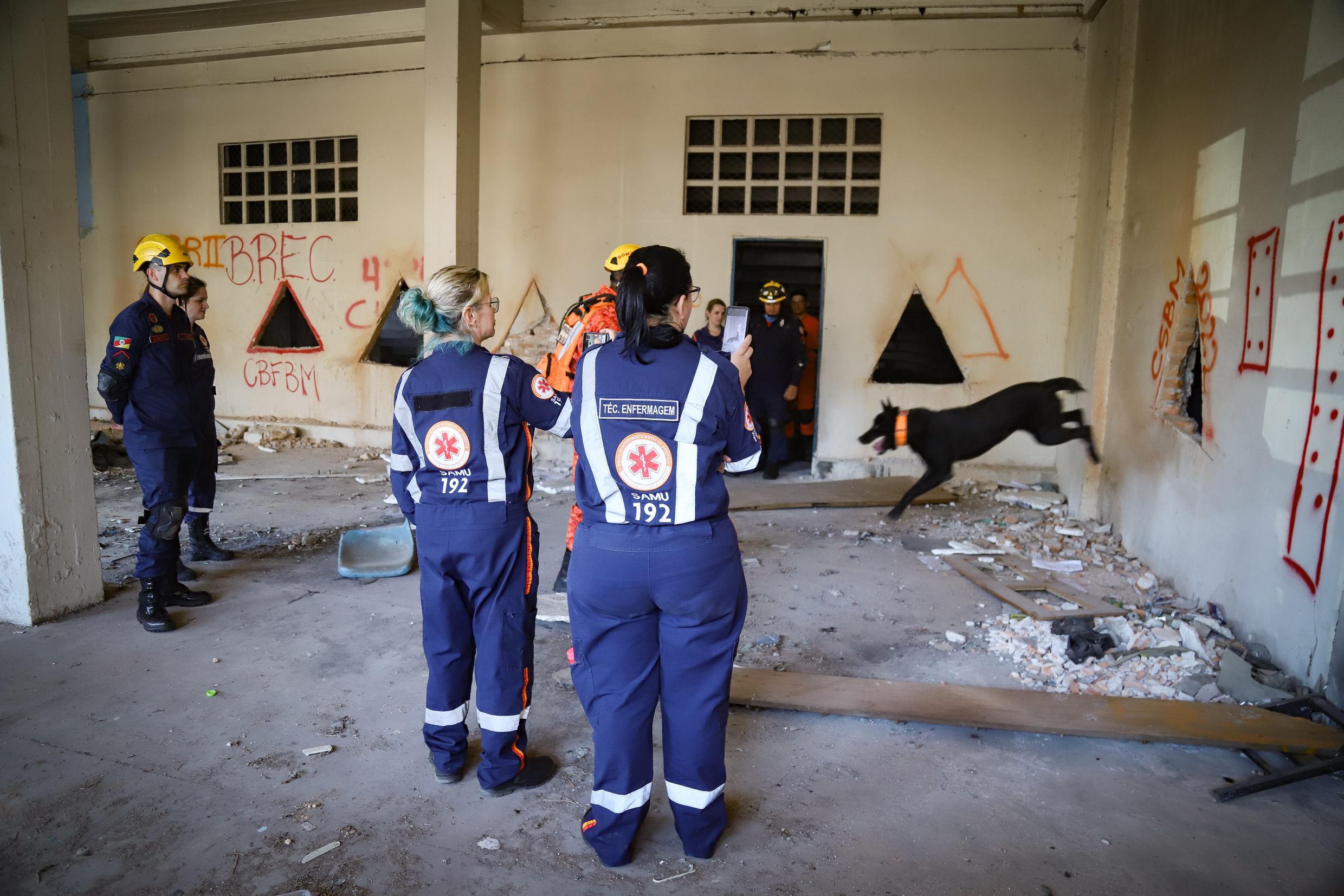 Porto Alegre, RS, 03/12/2025 Equipes do SAMU, vinculadas à Secretaria Municipal de Saúde, integraram um treinamento multidisciplinar ao lado da Defesa Civil e do Corpo de Bombeiros Militares do RS. Com aulas teóricas e simulações de resgate em estruturas colapsadas, a ação teve o objetivo de harmonizar os papéis de cada corporação em cenários de desabamento. O foco central foi aprimorar o trabalho integrado para assegurar a proteção dos agentes e o salvamento eficaz das vítimas. Na foto a parte prática realizada no antigo estádio Olímpico de Porto Alegre. Foto: Cristine Rochol/PMPA