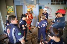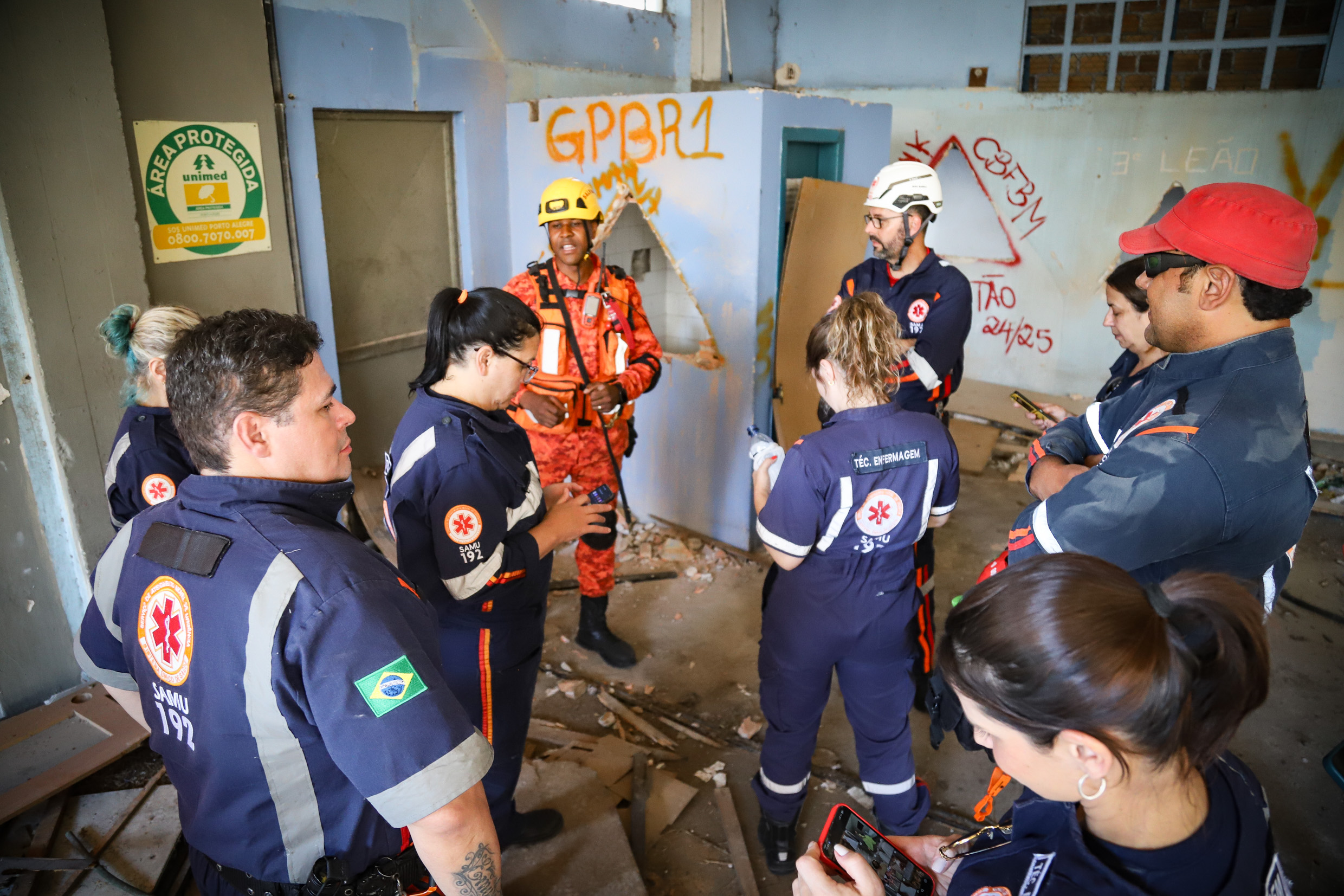Porto Alegre, RS, 03/12/2025 Equipes do SAMU, vinculadas à Secretaria Municipal de Saúde, integraram um treinamento multidisciplinar ao lado da Defesa Civil e do Corpo de Bombeiros Militares do RS. Com aulas teóricas e simulações de resgate em estruturas colapsadas, a ação teve o objetivo de harmonizar os papéis de cada corporação em cenários de desabamento. O foco central foi aprimorar o trabalho integrado para assegurar a proteção dos agentes e o salvamento eficaz das vítimas. Na foto a parte prática realizada no antigo estádio Olímpico de Porto Alegre. Foto: Cristine Rochol/PMPA