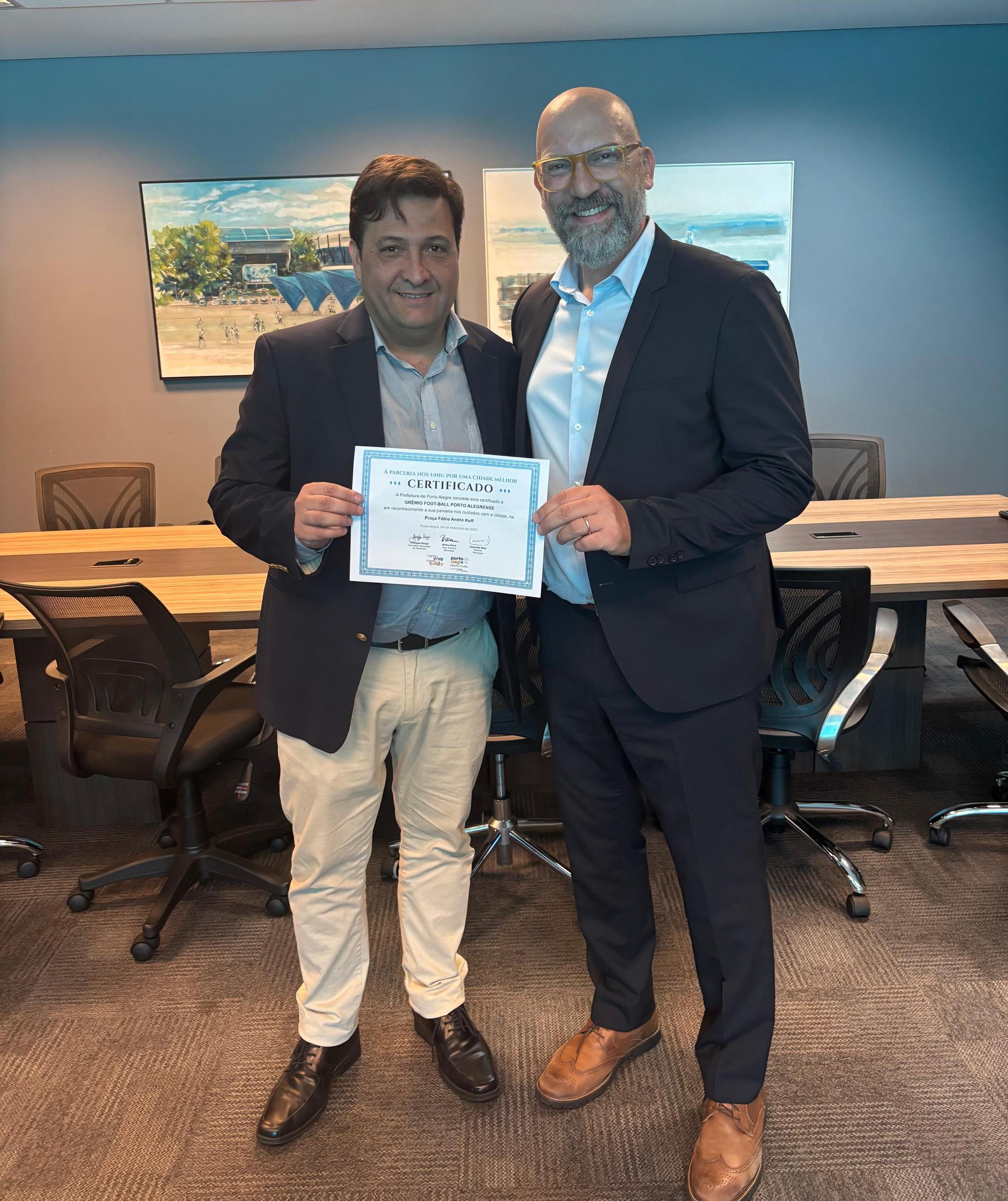 Porto Alegre, RS, Brasil, 04/12/2025: A Praça Fábio André Koff, no bairro Farrapos, passou a ser oficialmente adotada pelo Grêmio Foot-Ball Porto Alegrense. O termo de adoção foi formalizado na tarde desta quinta-feira, 4, pelo secretário adjunto de Parcerias, Fabiano Rheinheimer, e o presidente do clube, Alberto Guerra, durante visita à Arena. Foto: Paulo Albano/SMP