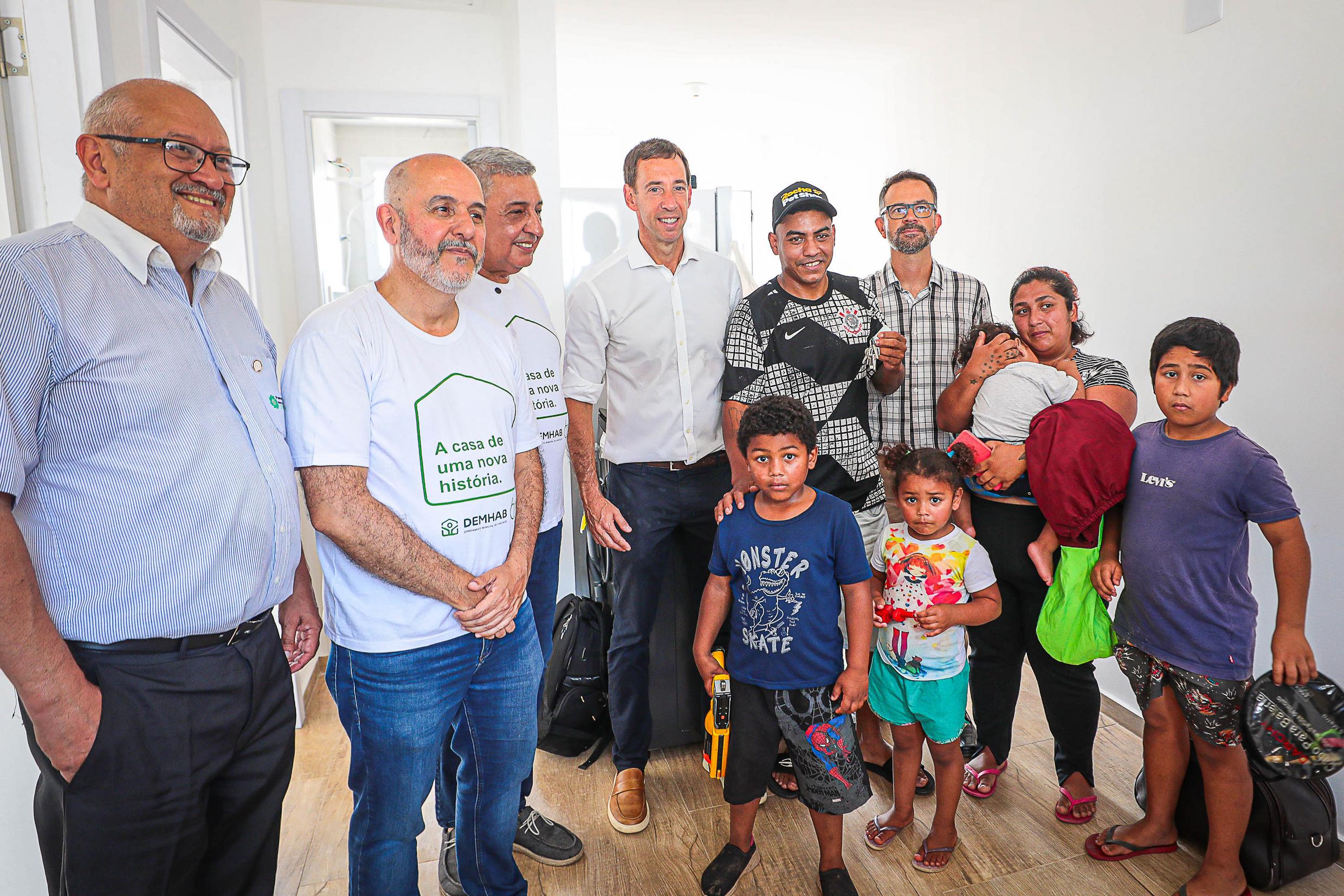 Porto Alegre, RS, Brasil, 08/12/2025: A Prefeitura de Porto Alegre e o Sindicato das Indústrias da Construção Civil do Estado do Rio Grande do Sul (Sinduscon-RS) realizaram nesta segunda-feira, 8, às 11h, a entrega de 31 unidades habitacionais na Rua Pedro Boticário, no bairro Glória. As moradias foram destinadas a famílias atingidas pelas enchentes e por outros eventos climáticos que impactaram a cidade. As casas foram doadas ao município pelo Sinduscon-RS, como parte de uma iniciativa voltada à reconstrução e ao apoio às populações mais vulneráveis diante dos recentes desastres naturais. Foto: Alex Rocha/PMPA