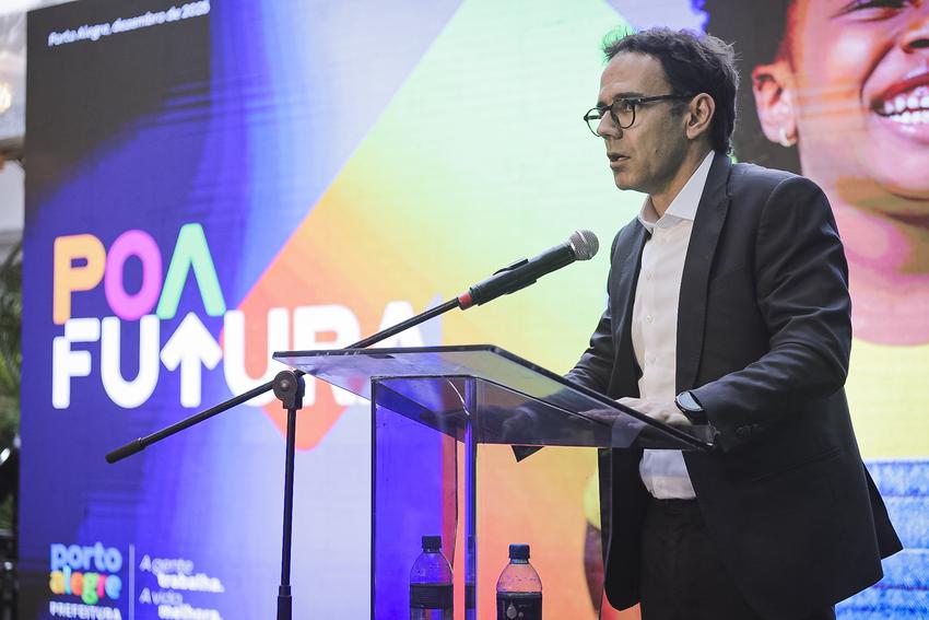 Porto Alegre, RS, Brasil - 08/12/2026 - A Prefeitura de Porto Alegre lançou nesta segunda-feira, 8, o POA Futura, programa que propõe uma ampla transformação urbana e social na capital gaúcha, com foco em áreas estratégicas como resiliência, qualidade de vida, inclusão social, mobilidade e gestão digital. O evento foi realizado às 17h, no Café da Catedral (rua Dom Sebastião, s/n, entre a Catedral Metropolitana e o Palácio Piratini), no bairro Centro Histórico. Local: Café da Catedral, R. Dom Sebastião - Centro Histórico. Fotos: Cesar Lopes/PMPA