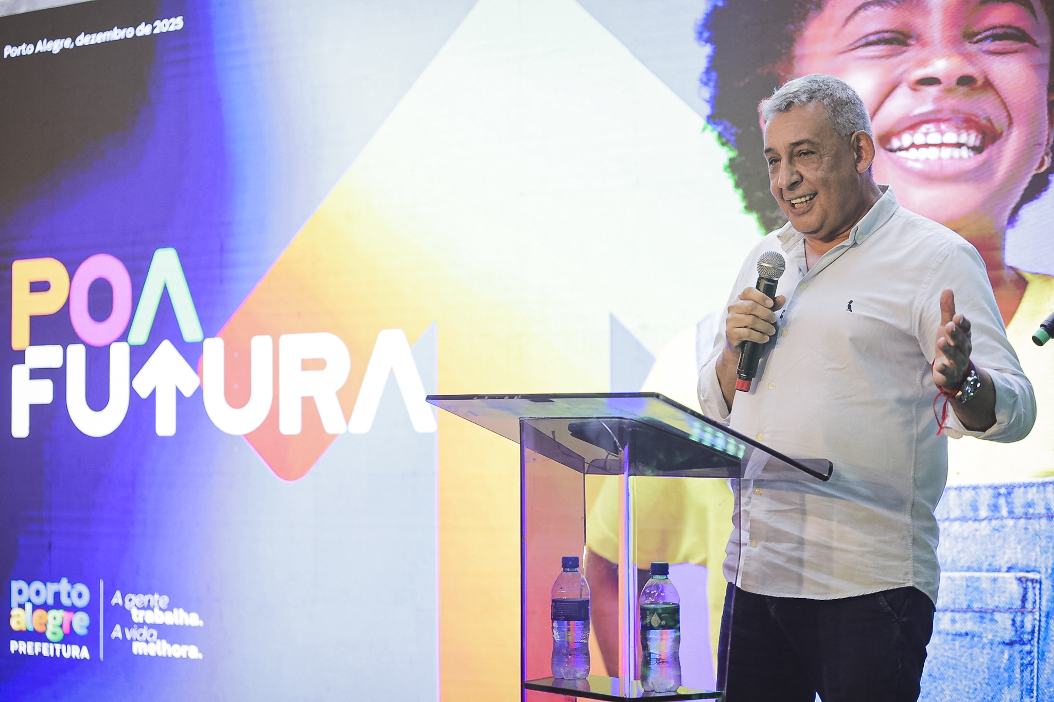 Porto Alegre, RS, Brasil - 08/12/2026 - A Prefeitura de Porto Alegre lançou nesta segunda-feira, 8, o POA Futura, programa que propõe uma ampla transformação urbana e social na capital gaúcha, com foco em áreas estratégicas como resiliência, qualidade de vida, inclusão social, mobilidade e gestão digital. O evento foi realizado às 17h, no Café da Catedral (rua Dom Sebastião, s/n, entre a Catedral Metropolitana e o Palácio Piratini), no bairro Centro Histórico. Local: Café da Catedral, R. Dom Sebastião - Centro Histórico. Fotos: Cesar Lopes/PMPA