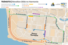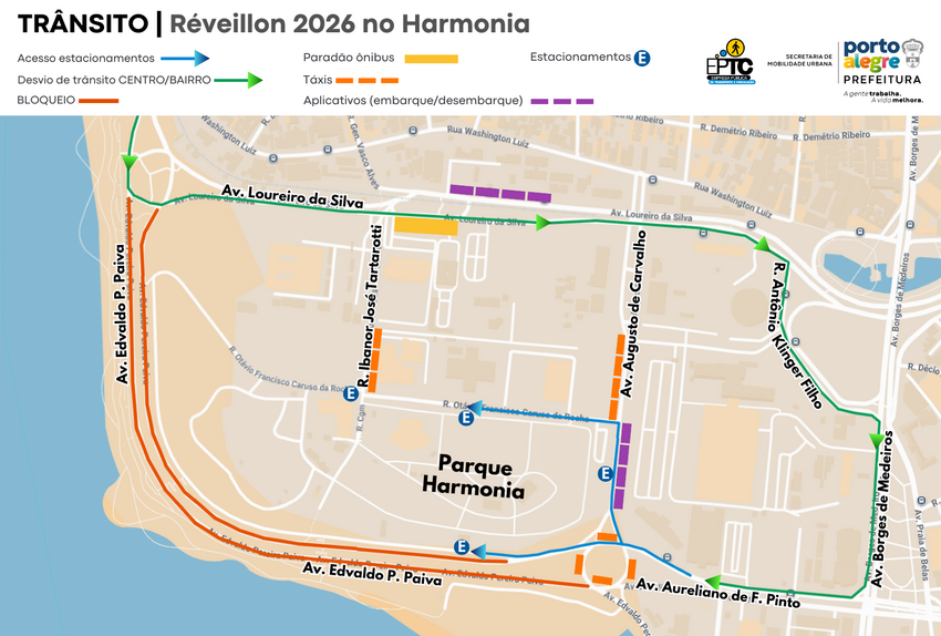 Porto Alegre, RS, Brasil, 19/12/2025: Mapa das operações de trânsito e transporte para o Réveillon 2026 no Parque Harmonia. Foto: Arte Carlos Rohde/EPTC