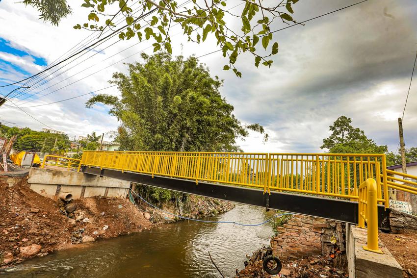 Porto Alegre, RS, Brasil, 22/12/2025: A Secretaria Municipal de Serviços Urbanos (Smsurb) finalizou a instalação do pontilhão sobre o arroio Feijó, no bairro Rubem Berta. A estrutura metálica, tem 19 metros de extensão e 1,24 metro de largura, ligando a rua Treze de Setembro ao município de Alvorada. Foto: Alex Rocha/PMPA