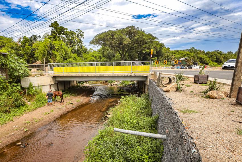 Porto Alegre, RS, Brasil, 22/12/2025: Obras da ponte do Salso, que liga as ruas Nilza da Silveira e do Cedro, no bairro Restinga. No local foram executadas obras de infraestrutura e alargamento da rua do Cedro, assim como serviços de drenagem, colocação de meio-fio, construção de muros e pavimentação. Foto: Alex Rocha/PMPA