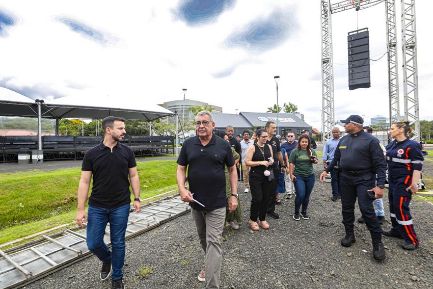 Porto Alegre, RS, Brasil, 29/12/2025: O prefeito, Sebastião Melo, realizou, na manhã desta segunda-feira (29), a vistoria final da infraestrutura para o Réveillon 2026, no Parque Maurício Sirotsky Sobrinho (Harmonia). A programação começa às 17h do dia 31 e segue até as 3h de 1º de janeiro. Conforme a concessionária GAM3 Parks, realizadora do evento, a expectativa é reunir cerca de 175 mil pessoas, que poderão celebrar a chegada de 2026 com shows nacionais e artistas da cultura local. À meia-noite, o céu será iluminado por um espetáculo de fogos, respeitando as normas estaduais sobre limites de ruído. A Prefeitura de Porto Alegre é patrocinadora do Réveillon 2026. Foto: Alex Rocha/PMPA