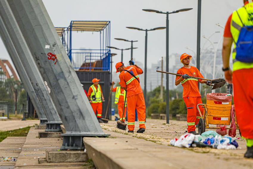 Porto Alegre, RS, Brasil, 01º/01/2026: Após a festa de Réveillon no Parque Harmonia, o Departamento Municipal de Limpeza Urbana (DMLU) montou uma operação especial de limpeza para o recolhimento de resíduos no entorno do evento. Já foram retiradas cinco toneladas de materiais da área e a previsão é de recolher mais três até o fim da manhã desta quinta-feira, 1º. As equipes foram mobilizadas após a meia-noite para os serviços de varrição, recolhimento de resíduos e lavagem das avenidas Presidente João Goulart e Edvaldo Pereira Paiva, além da Orla do Guaíba. A limpeza dentro do parque compete à concessionária GAM3 Parks. Foto: Alex Rocha/PMPA