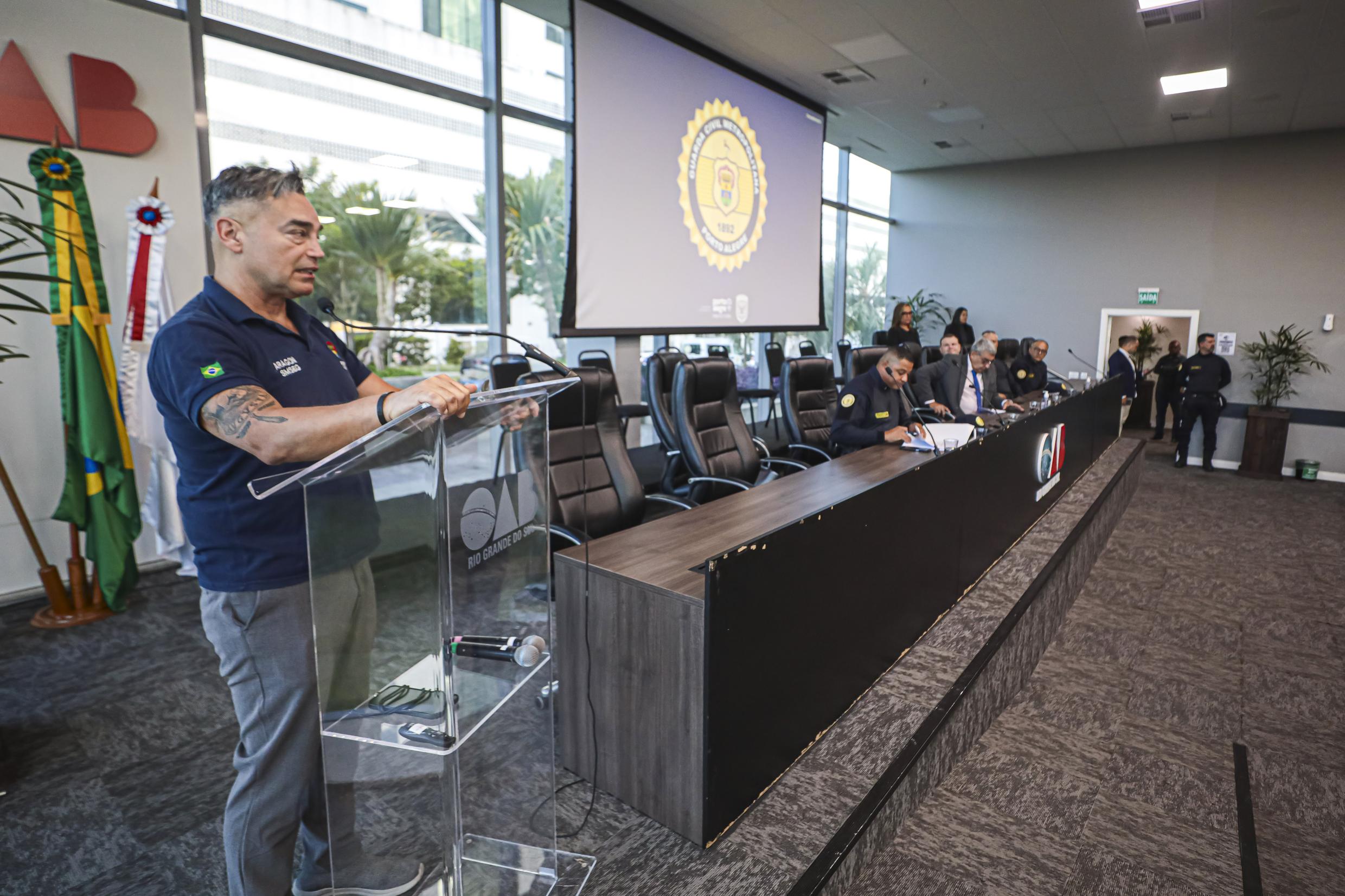 Porto Alegre, RS, Brasil, 05/01/2026: O prefeito, Sebastião Melo, participou, na manhã desta segunda-feira (05), no auditório da OAB-RS, da abertura do Seminário de Capacitação dos novos Guardas Civis de Porto Alegre. Foto: Alex Rocha/PMPA