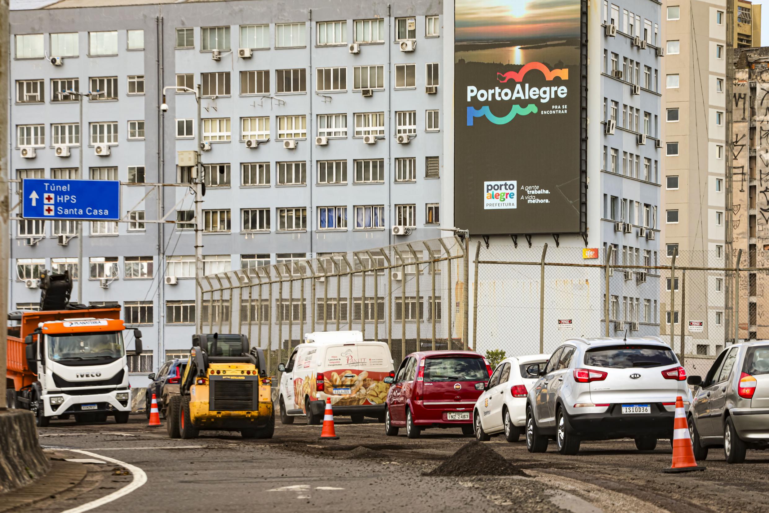 Porto Alegre, RS, Brasil, 08/01/2026: Teve início na quarta-feira, 7, a requalificação do pavimento asfáltico das rampas de acesso à avenida Mauá e ao Corredor Humanitário, pela avenida Castelo Branco, uma das principais portas de entrada de Porto Alegre. Os serviços são executados pela Secretaria Municipal de Serviços Urbanos (SMSurb). Foto: Alex Rocha/PMPA