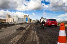 Porto Alegre, RS, Brasil, 08/01/2026: Teve início na quarta-feira, 7, a requalificação do pavimento asfáltico das rampas de acesso à avenida Mauá e ao Corredor Humanitário, pela avenida Castelo Branco, uma das principais portas de entrada de Porto Alegre. Os serviços são executados pela Secretaria Municipal de Serviços Urbanos (SMSurb). Foto: Alex Rocha/PMPA