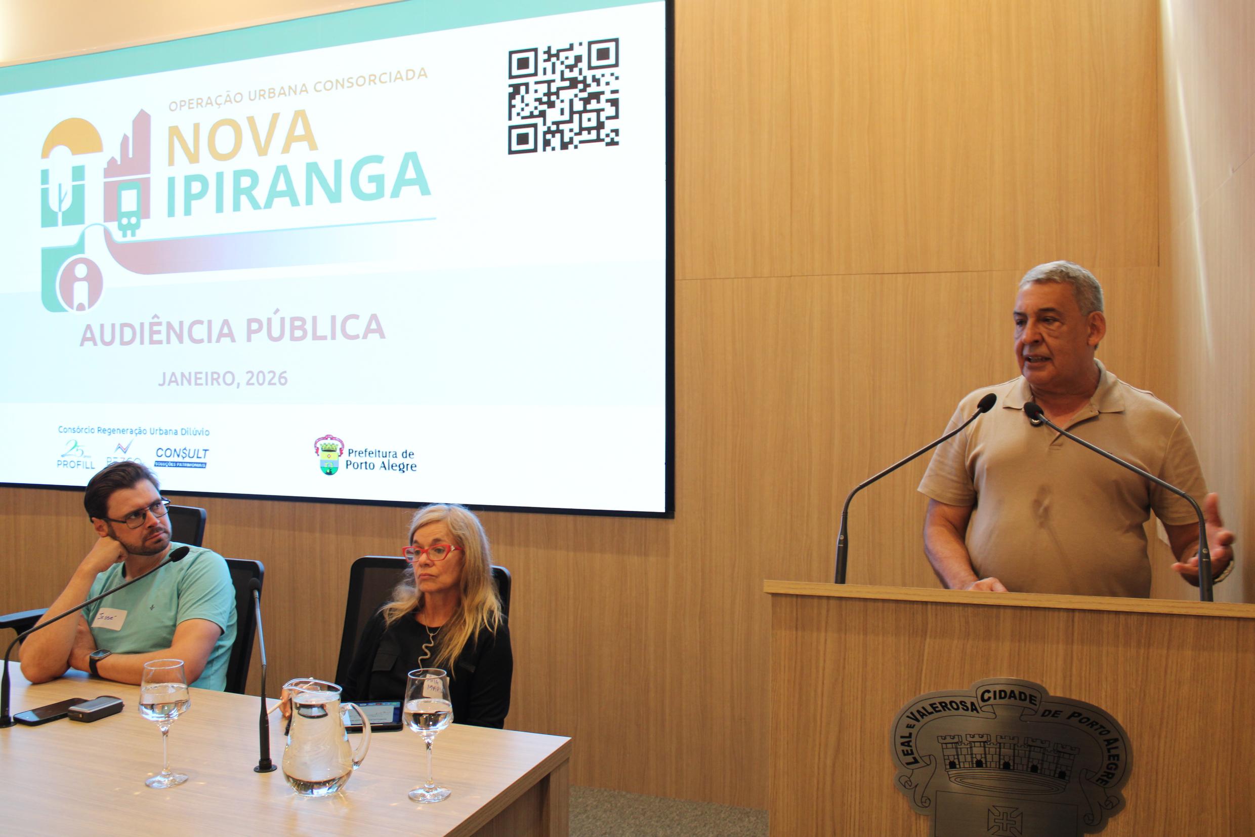 Porto Alegre - 28/01/2026: Nesta quarta-feira, 28, a população participou, de forma presencial e on-line, das duas audiências públicas promovidas para discutir o projeto da Operação Urbana Consorciada Nova Ipiranga, um instrumento urbanístico que busca despoluir o Arroio Dilúvio por meio de uma transformação urbana da área, recuperação ambiental, implantação de parque linear e melhorias em mobilidade, saneamento e drenagem. O prefeito Sebastião Melo participou da abertura. Foto: Sérgio Louruz / SMAMUS / PMPA