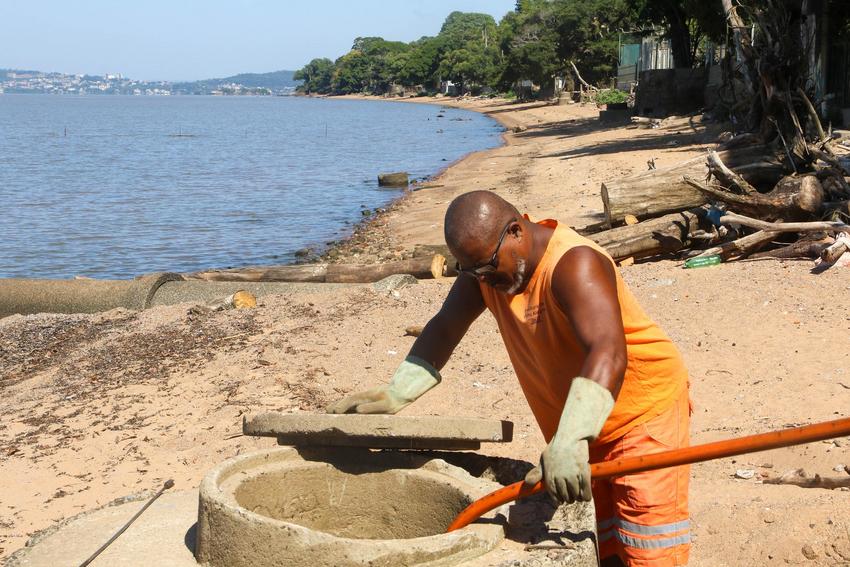 Porto Alegre, RS. 05/02/2026. DMAE realiza serviço de desobstrução e limpeza da rede de esgoto cloacal na praia da Pedra Redonda.
