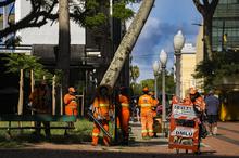 Porto Alegre, RS, Brasil, 19/02/2026: Equipes da prefeitura realizam serviços de capina na Praça da Alfândega, bairro Centro Histórico, na manhã desta quinta-feira (19). Foto: Alex Rocha/PMPA