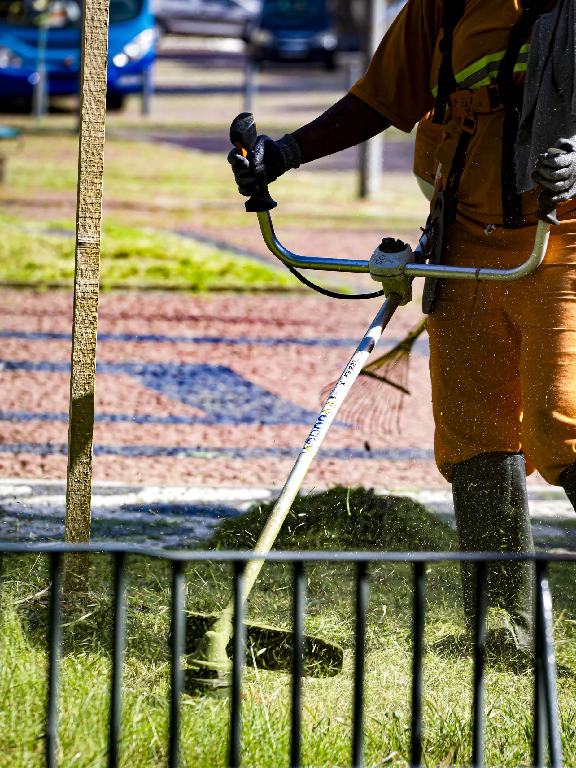 Porto Alegre, RS, Brasil, 19/02/2026: Equipes da prefeitura realizam serviços de capina na Praça da Alfândega, bairro Centro Histórico, na manhã desta quinta-feira (19). Foto: Alex Rocha/PMPA