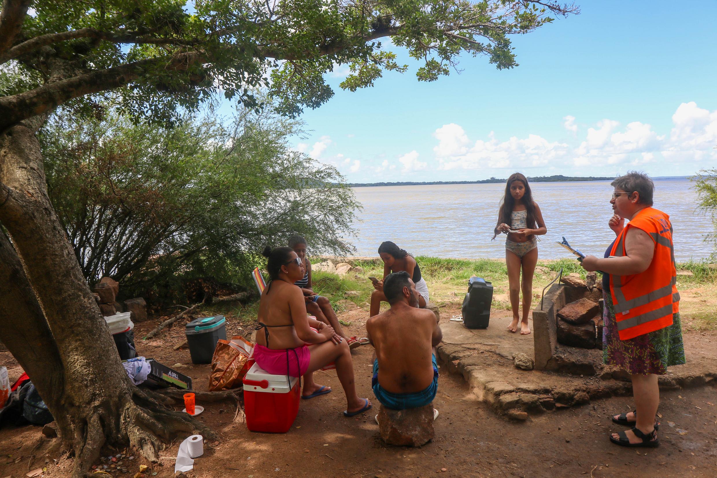 Porto Alegre, RS. 21/02/2026. Técnico Social do Sistema de Abastecimento de Água (SAA) Ponta do Arado realiza ação educativa nas praias do bairro Belém Novo.