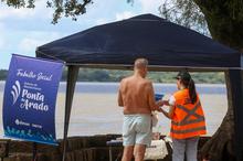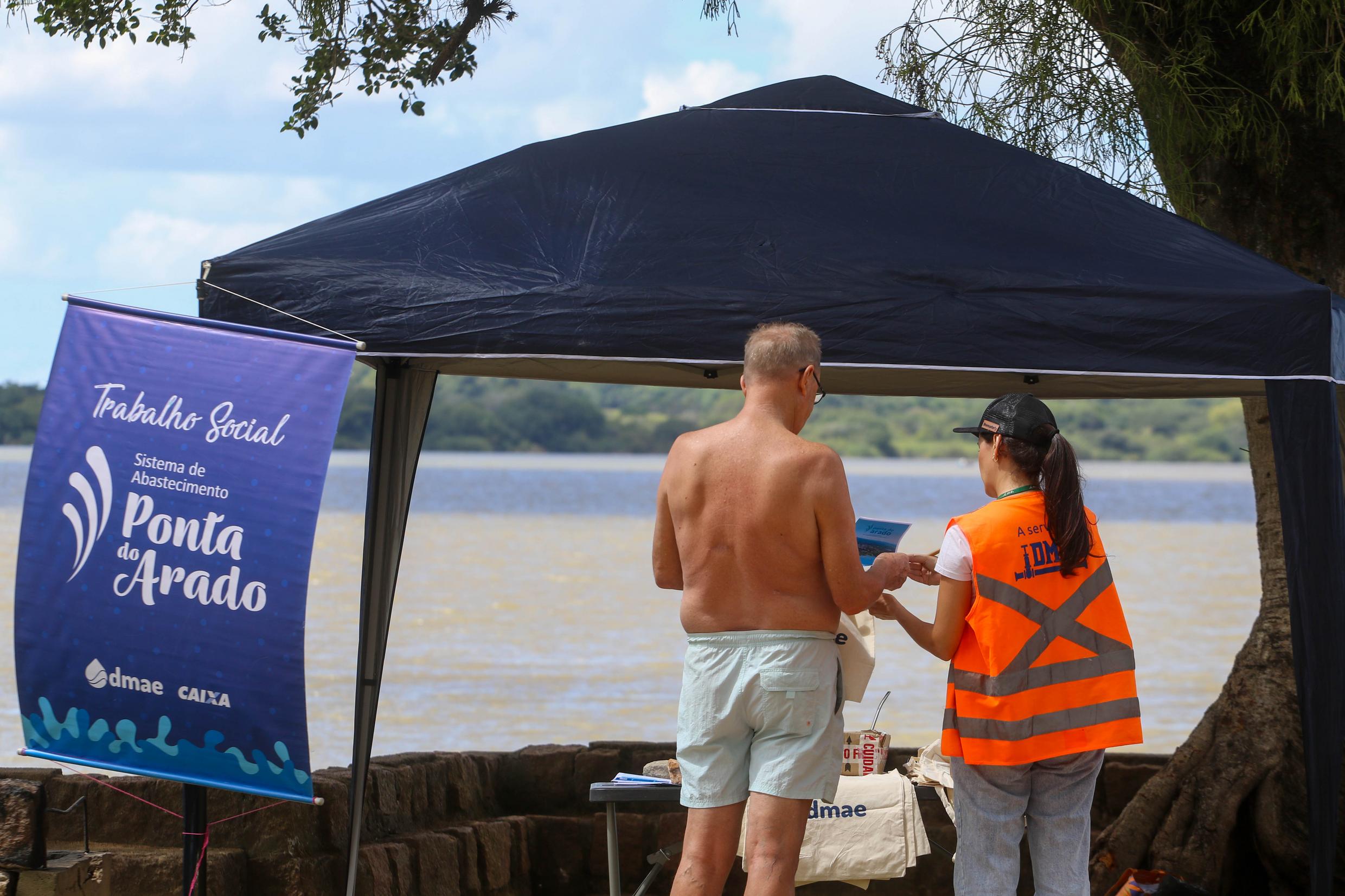 Porto Alegre, RS. 21/02/2026. Técnico Social do Sistema de Abastecimento de Água (SAA) Ponta do Arado realiza ação educativa nas praias do bairro Belém Novo.