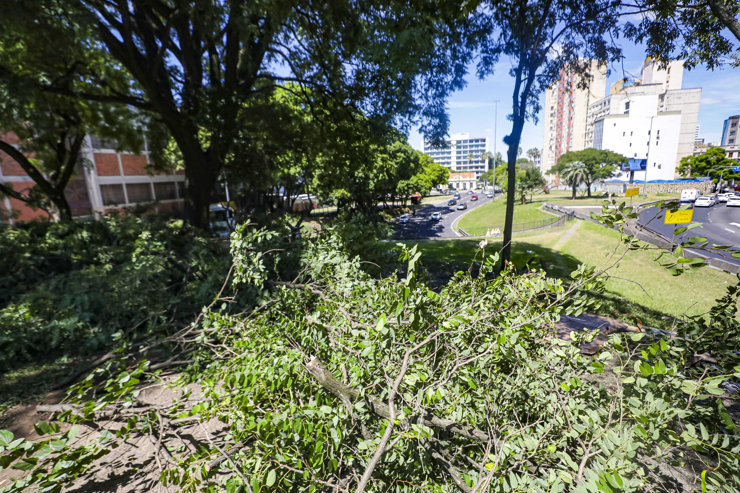 Porto Alegre, RS, Brasil, 23/02/2026: Equipes da prefeitura realizaram, nesta segunda-feira (23), o serviço de podas de manutenção no entorno do Viaduto da Conceição. Foto: Alex Rocha/PMPA