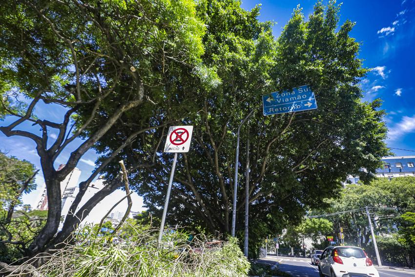 Porto Alegre, RS, Brasil, 23/02/2026: Equipes da prefeitura realizaram, nesta segunda-feira (23), o serviço de podas de manutenção no entorno do Viaduto da Conceição. Foto: Alex Rocha/PMPA