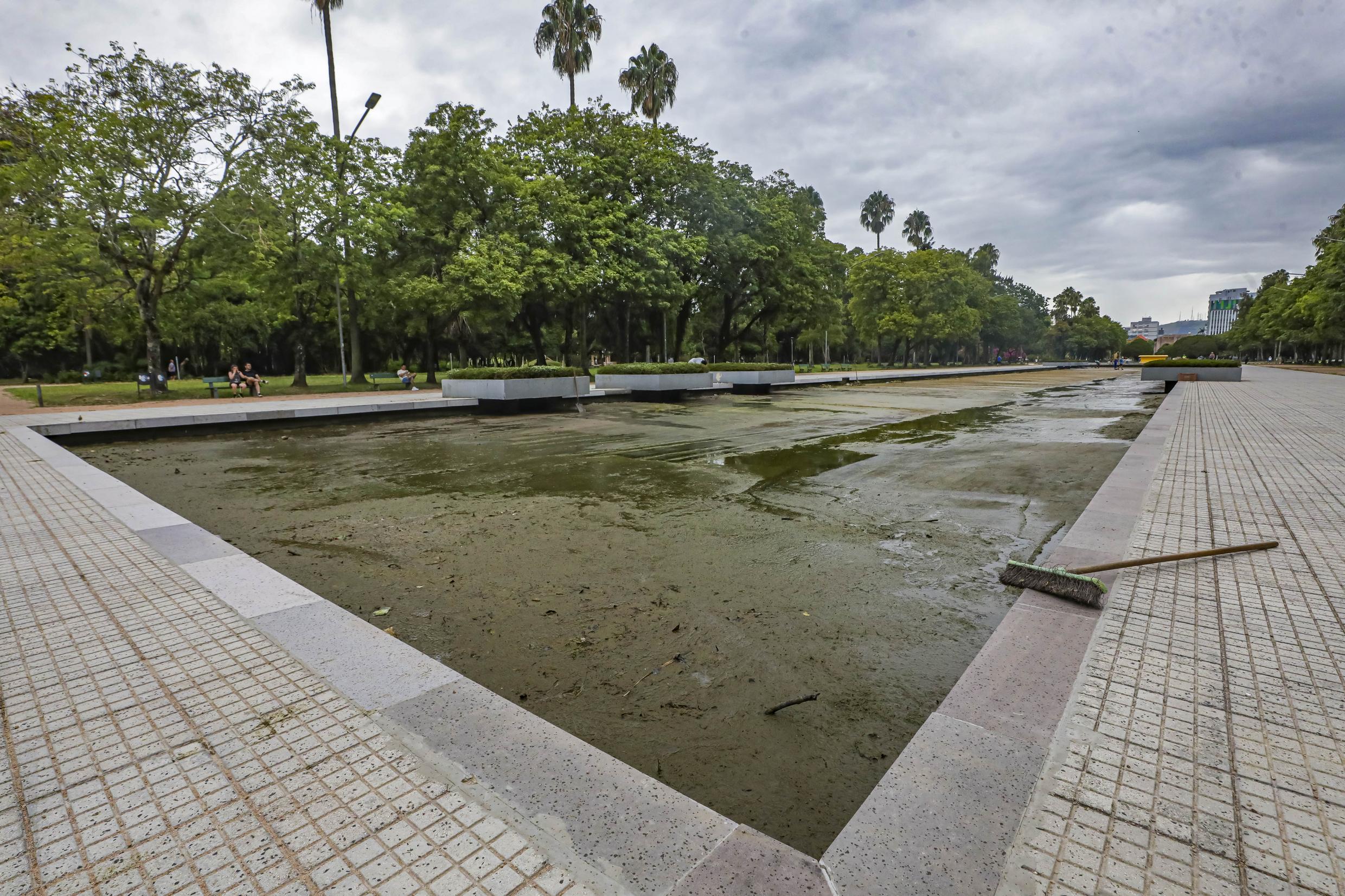 Porto Alegre, RS, Brasil, 24/02/2026: A Secretaria Municipal de Serviços Urbanos (SMSUrb), executa o serviço de limpeza do espelho d'água da Redenção. A manutenção ocorre trimestralmente e o processo de limpeza inicia com a remoção da água, depois as equipes removem o lodo e os resíduos do fundo do espelho e, por fim, é reabastecido o espelho d'água. Foto: Alex Rocha/PMPA
