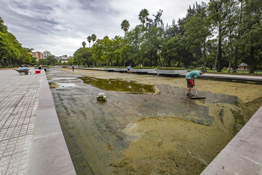 Porto Alegre, RS, Brasil, 24/02/2026: A Secretaria Municipal de Serviços Urbanos (SMSUrb), executa o serviço de limpeza do espelho d'água da Redenção. A manutenção ocorre trimestralmente e o processo de limpeza inicia com a remoção da água, depois as equipes removem o lodo e os resíduos do fundo do espelho e, por fim, é reabastecido o espelho d'água. Foto: Alex Rocha/PMPA