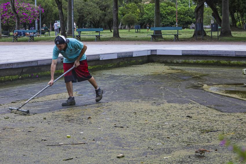 Porto Alegre, RS, Brasil, 24/02/2026: A Secretaria Municipal de Serviços Urbanos (SMSUrb), executa o serviço de limpeza do espelho d'água da Redenção. A manutenção ocorre trimestralmente e o processo de limpeza inicia com a remoção da água, depois as equipes removem o lodo e os resíduos do fundo do espelho e, por fim, é reabastecido o espelho d'água. Foto: Alex Rocha/PMPA