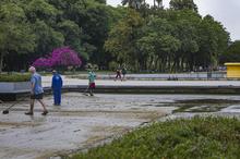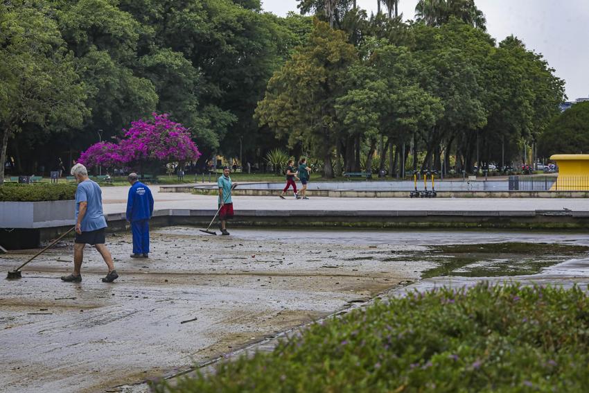 Porto Alegre, RS, Brasil, 24/02/2026: A Secretaria Municipal de Serviços Urbanos (SMSUrb), executa o serviço de limpeza do espelho d'água da Redenção. A manutenção ocorre trimestralmente e o processo de limpeza inicia com a remoção da água, depois as equipes removem o lodo e os resíduos do fundo do espelho e, por fim, é reabastecido o espelho d'água. Foto: Alex Rocha/PMPA