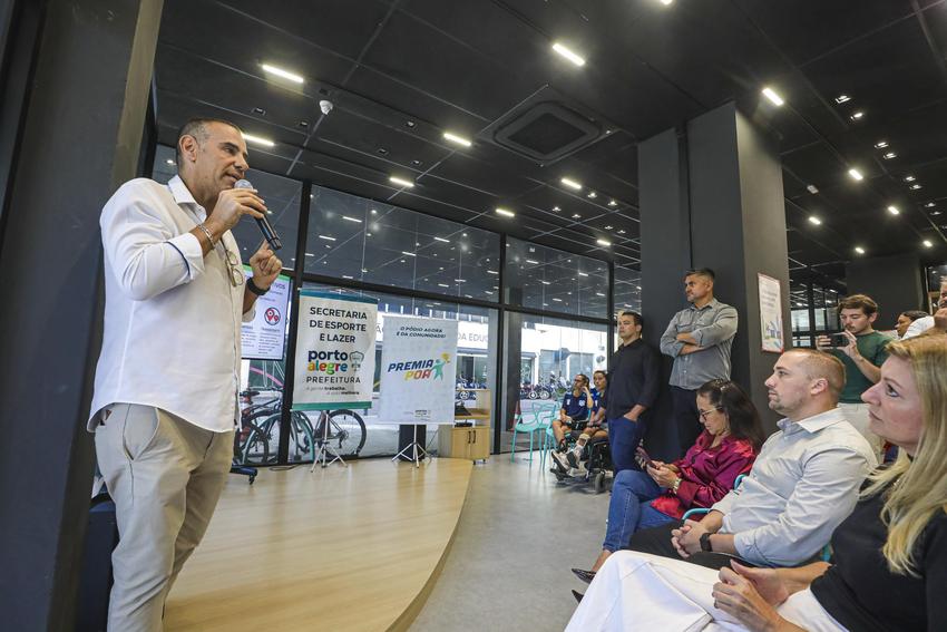 Porto Alegre, RS, Brasil, 26/02/2026: Na manhã desta quinta-feira (26), no espaço SmartLab da Procempa, localizado no térreo do Centro Administrativo Municipal Guilherme Socias Villela (CAM), ocorreu a cerimônia de lançamento do projeto Premia POA, da Secretaria Municipal de Esporte e Lazer (Smel). O Projeto, visa incentivar os eventos esportivos comunitários, amadores e escolares de Porto Alegre por meio do fornecimento de kit’s de premiação (troféus e medalhas) e infraestrutura (toldos e sonorização). Foto: Alex Rocha/PMPA