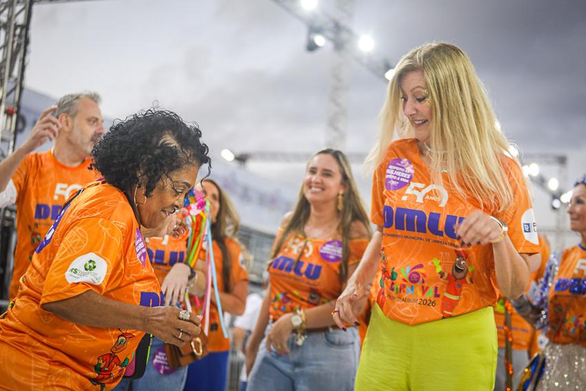 Porto Alegre, RS, Brasil, 27/02/2026: O Bloco da Sustentabilidade, do Departamento Municipal de Limpeza Urbana (DMLU), abre a primeira noite de desfiles no Complexo Cultural do Porto Seco. Equipes identificadas com camisetas da Rede Conta Comigo fizeram abordagem do público presente, distribuindo abanadores informativos e materiais explicativos sobre os serviços de apoio disponíveis no município. Foto: Alex Rocha/PMPA