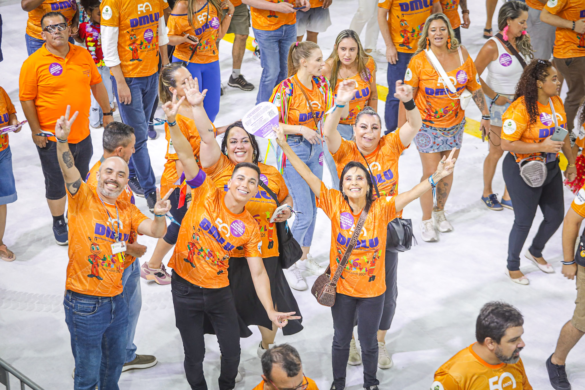 Porto Alegre, RS, Brasil, 27/02/2026: O Bloco da Sustentabilidade, do Departamento Municipal de Limpeza Urbana (DMLU), abre a primeira noite de desfiles no Complexo Cultural do Porto Seco. Equipes identificadas com camisetas da Rede Conta Comigo fizeram abordagem do público presente, distribuindo abanadores informativos e materiais explicativos sobre os serviços de apoio disponíveis no município. Foto: Alex Rocha/PMPA