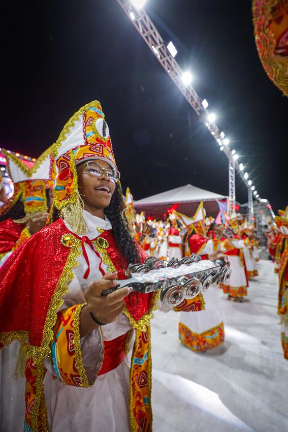 Porto Alegre, RS, Brasil, 27/02/2026: A União da Vila do IAPI, que entrou na avenida nesta sexta-feira, 27, levou para a avenida no Carnaval de 2026 o enredo Umbanda! Luz, Amor, Reinos e Planos!, uma celebração da religiosidade afro-brasileira e de sua importância na formação da identidade nacional. A escola contou a trajetória dessa fé nascida do sincretismo entre tradições africanas, indígenas, cristãs e espíritas, destacando sua missão de promover a caridade, a evolução espiritual e o respeito à diversidade por meio da conexão entre o mundo físico e os diferentes planos espirituais. Foto: Alex Rocha/PMPA