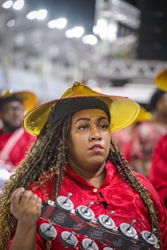 Porto Alegre, RS, Brasil, 27/02/2026: O Complexo Cultural do Porto Seco recebeum nesta sexta-feira, 27, a G.R.E.S.B.C.E.S. Filhos de Maria. A escola levou para a avenida o enredo Xilogravura, uma imersão poética na técnica de imprimir histórias através da madeira. A escola transformou o desfile em uma galeria viva, celebrando a estética do Ukiyo-e e a conexão entre a arte oriental e a expressão popular. A narrativa exalta a disciplina e a espiritualidade de culturas milenares, mostrando como o corte preciso na madeira revela a alma de um povo. Foto: Alex Rocha/PMPA