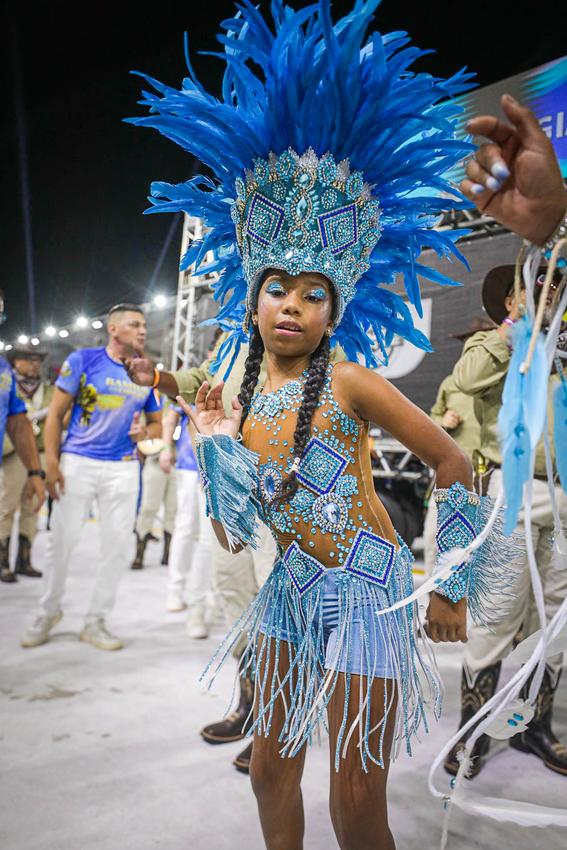 Porto Alegre, RS, Brasil, 27/02/2026: A S.B.C. Bambas da Orgia trouxe para o Complexo Cultural do Porto Seco nesta sexta-feira, 27, o enredo Apaguem as luzes!, uma celebração lúdica e poética ao fascínio da sétima arte. A escola transformou o desfile em uma grande sessão de cinema, o Cine Bambas, onde a narrativa se guiou pelas emoções e sensações proporcionadas pelas telonas, desde o mistério das sombras até o brilho do sucesso. Foto: Alex Rocha/PMPA