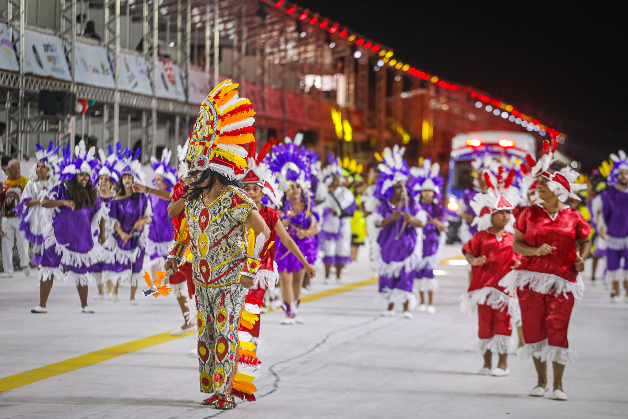 Porto Alegre, RS, Brasil, 28/02/2026: A S.R.E B.Tribo Carnavalesca Os Comanches levou para o Complexo Cultural do Porto Seco, neste sábado, 28, o enredo Wakay o Guardião da Floresta e a Lenda da Borduna Encantada. A escola apresentou uma narrativa marcada pela ancestralidade e pela espiritualidade indígena, contando a trajetória do cacique Wakay e de seu filho, o jovem guerreiro Potencí, escolhido para defender seu povo sob a proteção de Tupã. Foto: Alex Rocha/PMPA