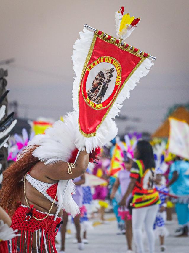 Porto Alegre, RS, Brasil, 28/02/2026: A S.R.E B.Tribo Carnavalesca Os Comanches levou para o Complexo Cultural do Porto Seco, neste sábado, 28, o enredo Wakay o Guardião da Floresta e a Lenda da Borduna Encantada. A escola apresentou uma narrativa marcada pela ancestralidade e pela espiritualidade indígena, contando a trajetória do cacique Wakay e de seu filho, o jovem guerreiro Potencí, escolhido para defender seu povo sob a proteção de Tupã. Foto: Alex Rocha/PMPA