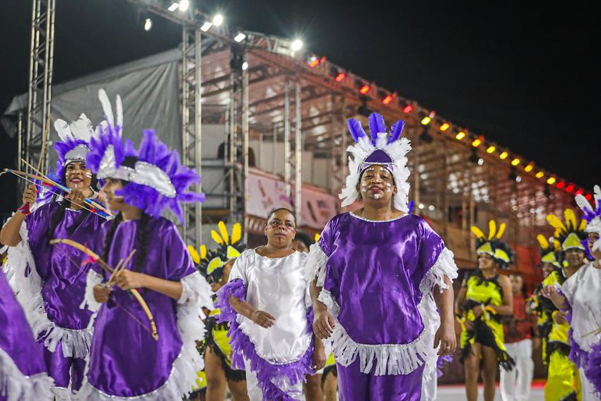 Porto Alegre, RS, Brasil, 28/02/2026: A S.R.E B.Tribo Carnavalesca Os Comanches levou para o Complexo Cultural do Porto Seco, neste sábado, 28, o enredo Wakay o Guardião da Floresta e a Lenda da Borduna Encantada. A escola apresentou uma narrativa marcada pela ancestralidade e pela espiritualidade indígena, contando a trajetória do cacique Wakay e de seu filho, o jovem guerreiro Potencí, escolhido para defender seu povo sob a proteção de Tupã. Foto: Alex Rocha/PMPA