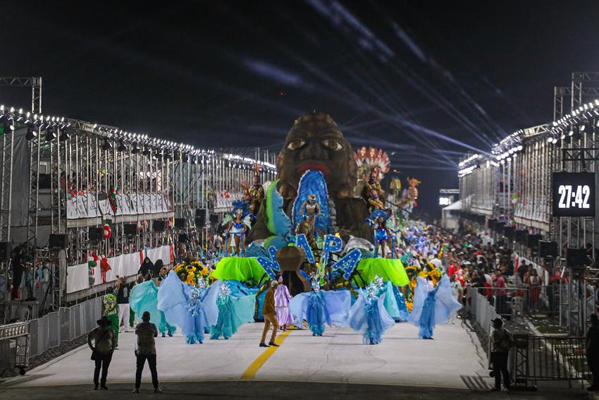 Porto Alegre, RS, Brasil, 28/02/2026: A S.B.R.C. Academia de Samba Unidos da Vila Mapa trouxe para a avenida, neste sábado, 28, o enredo Às Margens da Poesia, no Caminho das Águas: Um Banho de Axé. O desfile apresentou uma narrativa simbólica e sensorial onde a água não é apenas uma personagem, mas a própria linguagem que conduz o espectador por uma jornada de renovação e fé. Foto: Alex Rocha/PMPA
