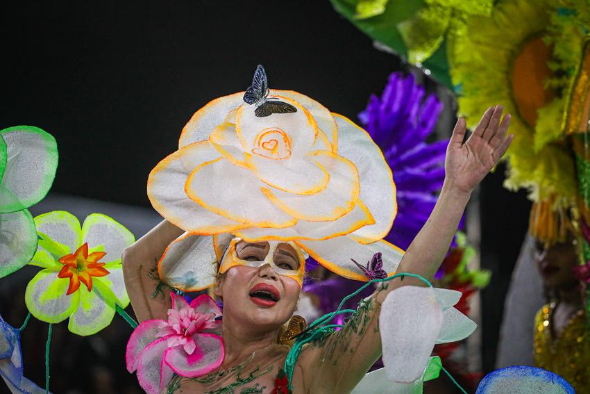 Porto Alegre, RS, Brasil, 28/02/2026: A S.B.R.C. Academia de Samba Unidos da Vila Mapa trouxe para a avenida, neste sábado, 28, o enredo Às Margens da Poesia, no Caminho das Águas: Um Banho de Axé. O desfile apresentou uma narrativa simbólica e sensorial onde a água não é apenas uma personagem, mas a própria linguagem que conduz o espectador por uma jornada de renovação e fé. Foto: Alex Rocha/PMPA