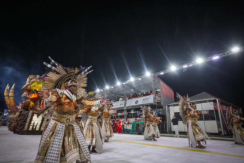 Porto Alegre, RS, Brasil, 01/03/2026: A S.B.R. Imperadores do Samba entra na avenida na madrugada deste domingo (01) com o enredo Orin Alá – Canto para Sonhar. A escola narrou a lenda da princesa africana Orin Alá, cuja trajetória é marcada pela ruptura da paz em sua terra natal, o sequestro por navios negreiros e a resistência através do seu canto sagrado em solo brasileiro. A narrativa exalta a voz como um instrumento de cura e liberdade, capaz de conduzir um sonho coletivo que reconecta o povo escravizado às suas raízes e identidade africana. Foto: Alex Rocha/PMPA