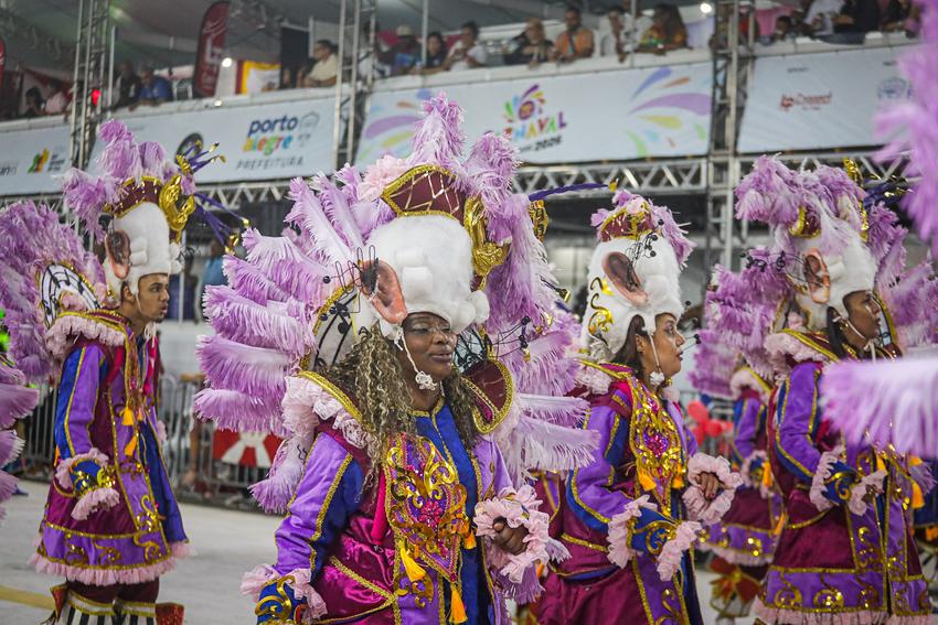 Porto Alegre, RS, Brasil, 01/03/2026: A S.R.B. Estado Maior da Restinga participou do Carnaval de Porto Alegre na madrugada deste domingo (01). A escola apresentou o enredo Restinga, o canto de todos os povos, que reconta a trajetória do bairro, desde a sua ocupação por famílias removidas de diversas áreas de Porto Alegre até a transformação em um polo de cultura e resistência. A narrativa exaltou a superação de um povo que, diante do esquecimento social, construiu com as próprias mãos uma cidade vibrante. Foto: Alex Rocha/PMPA