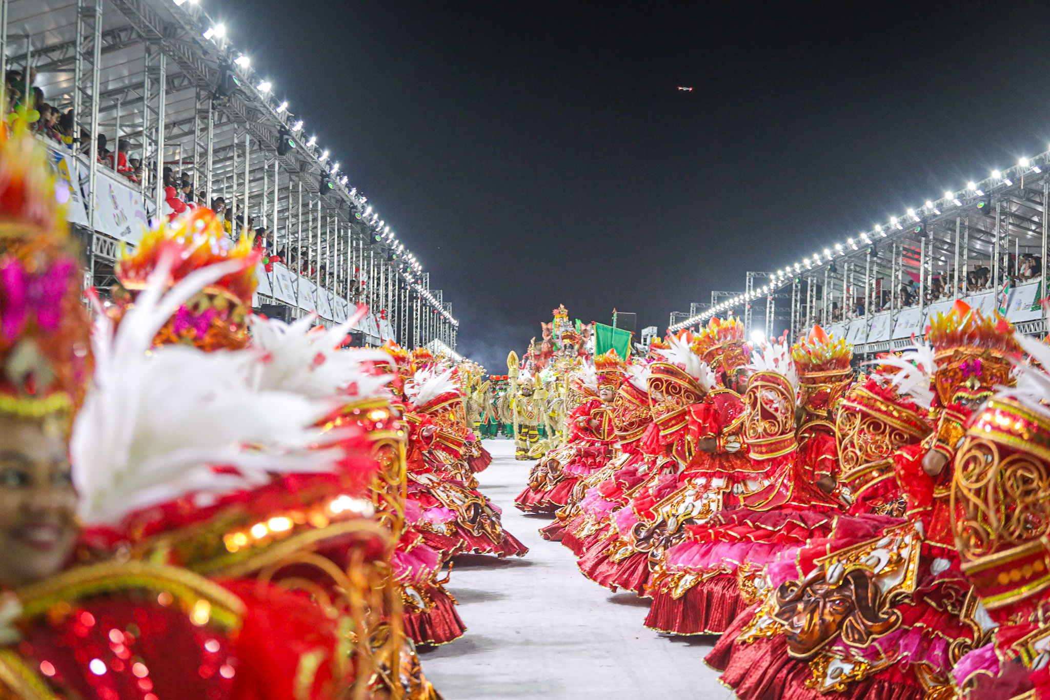Porto Alegre, RS, Brasil, 01/03/2026: A S.R.B. Estado Maior da Restinga participou do Carnaval de Porto Alegre na madrugada deste domingo (01). A escola apresentou o enredo Restinga, o canto de todos os povos, que reconta a trajetória do bairro, desde a sua ocupação por famílias removidas de diversas áreas de Porto Alegre até a transformação em um polo de cultura e resistência. A narrativa exaltou a superação de um povo que, diante do esquecimento social, construiu com as próprias mãos uma cidade vibrante. Foto: Alex Rocha/PMPA