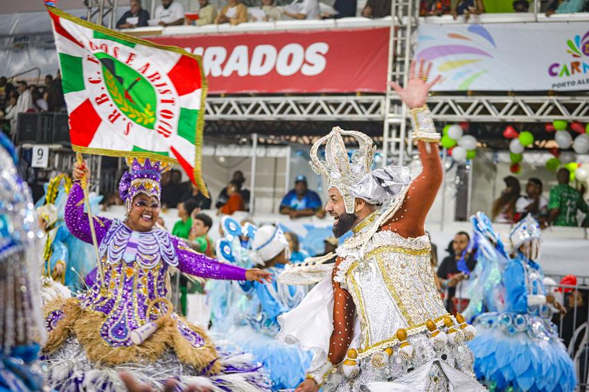 Porto Alegre, RS, Brasil, 01/03/2026: No Carnaval de Porto Alegre 2026, a S.R.C. Fidalgos e Aristocratas apresentou como enredo No meu Patuá carrego a minha Fé. A escola mergulhou no universo da espiritualidade brasileira, explorando a força dos amuletos, das rezas e da proteção que acompanha o povo em sua caminhada. A narrativa exaltou o sincretismo religioso e a ancestralidade, mostrando como a fé se manifesta através de elementos sagrados que guardam o corpo e a alma contra as adversidades do destino. Foto: Alex Rocha/PMPA