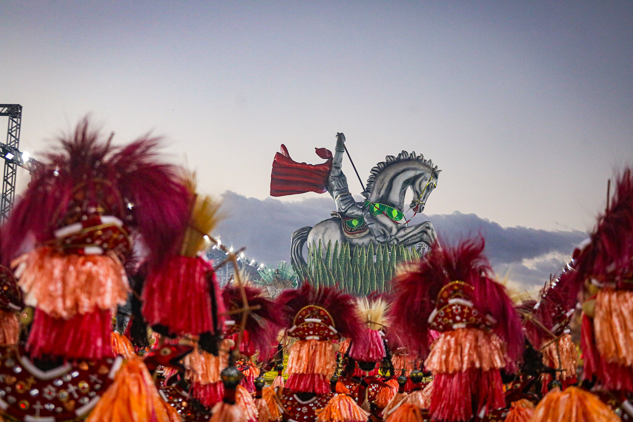 Porto Alegre, RS, Brasil, 01/03/2026: No Carnaval de Porto Alegre 2026, a S.R.C. Fidalgos e Aristocratas apresentou como enredo No meu Patuá carrego a minha Fé. A escola mergulhou no universo da espiritualidade brasileira, explorando a força dos amuletos, das rezas e da proteção que acompanha o povo em sua caminhada. A narrativa exaltou o sincretismo religioso e a ancestralidade, mostrando como a fé se manifesta através de elementos sagrados que guardam o corpo e a alma contra as adversidades do destino. Foto: Alex Rocha/PMPA