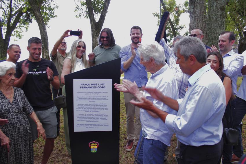 Porto Alegre, RS, Brasil, 28/02/2026: A capital gaúcha tem um novo espaço de lazer e convívio no bairro Petrópolis. A Praça José Luiz Fernandes Cogo foi entregue à comunidade, neste sábado, 28, pelo prefeito Sebastião Melo e pelo secretário do Meio Ambiente, Urbanismo e Sustentabilidade, Germano Bremm. Localizada no cruzamento da Avenida Professor Cristiano Fischer com as ruas Winston Churchill, Pirâmide e João Benjamin Zaffari, é uma homenagem ao engenheiro civil, professor e servidor público que dedicou quase quatro décadas à Prefeitura da Cidade. Foto: Alejandro Sanchez/SMAMUS
