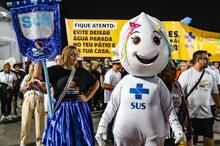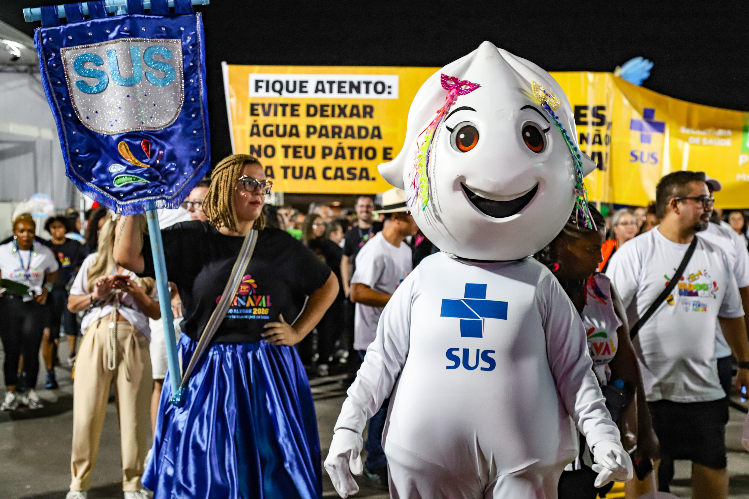 Porto Alegre, RS, 27/02/2026 O Carnaval de Porto Alegre no Complexo Cultural do Porto Seco contou com uma estrutura completa de saúde para o público. Além de uma UPA, equipes volantes realizaram ações preventivas com distribuição de materiais sobre dengue e ISTs, entrega de preservativos, lubrificantes, autotestes de HIV e hidratação. O destaque ficou para o Bloco da Saúde, que levou cerca de 250 servidores à avenida com samba-enredo próprio e a presença ilustre do Zé Gotinha e sua família. Foto: Cristine Rochol/PMPA