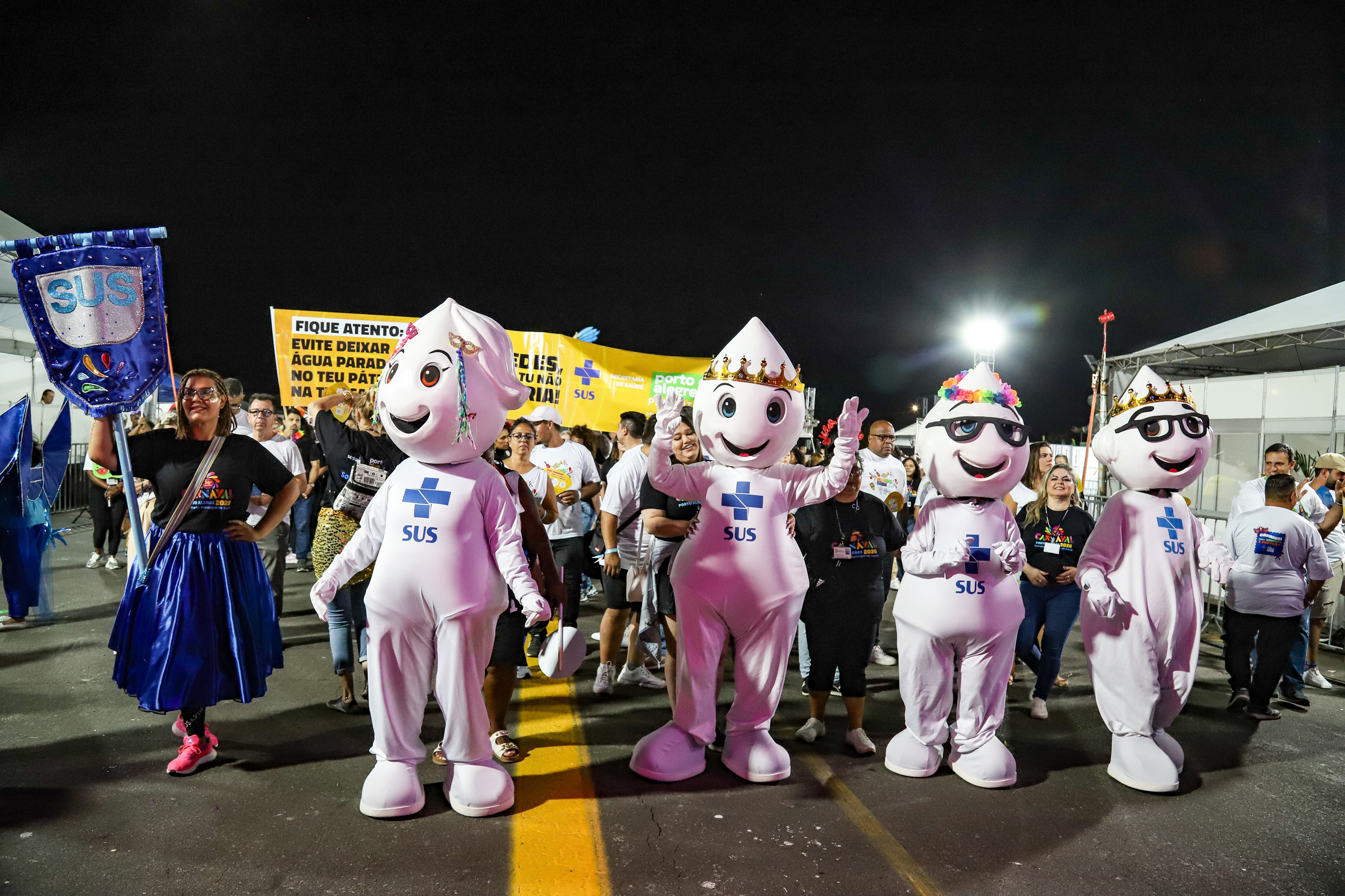 Porto Alegre, RS, 27/02/2026 O Carnaval de Porto Alegre no Complexo Cultural do Porto Seco contou com uma estrutura completa de saúde para o público. Além de uma UPA, equipes volantes realizaram ações preventivas com distribuição de materiais sobre dengue e ISTs, entrega de preservativos, lubrificantes, autotestes de HIV e hidratação. O destaque ficou para o Bloco da Saúde, que levou cerca de 250 servidores à avenida com samba-enredo próprio e a presença ilustre do Zé Gotinha e sua família. Foto: Cristine Rochol/PMPA