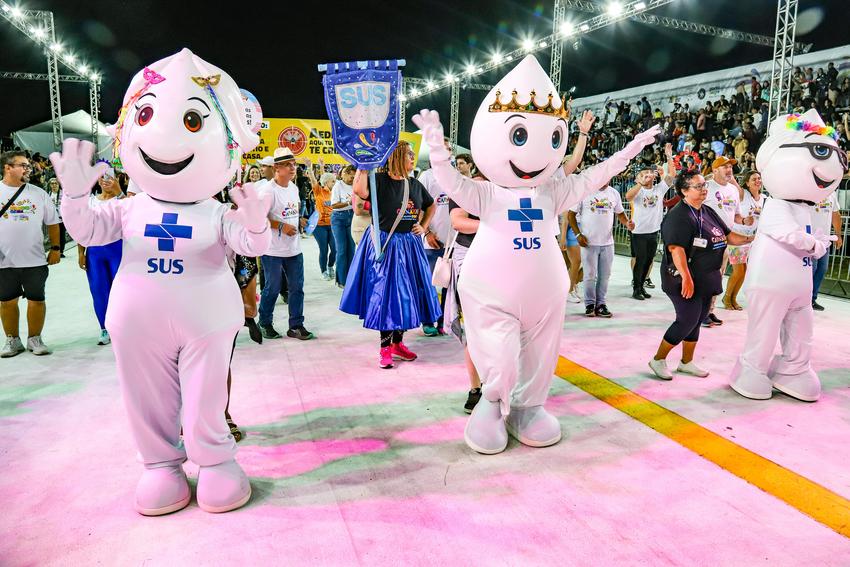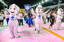 Porto Alegre, RS, 27/02/2026 O Carnaval de Porto Alegre no Complexo Cultural do Porto Seco contou com uma estrutura completa de saúde para o público. Além de uma UPA, equipes volantes realizaram ações preventivas com distribuição de materiais sobre dengue e ISTs, entrega de preservativos, lubrificantes, autotestes de HIV e hidratação. O destaque ficou para o Bloco da Saúde, que levou cerca de 250 servidores à avenida com samba-enredo próprio e a presença ilustre do Zé Gotinha e sua família. Foto: Cristine Rochol/PMPA